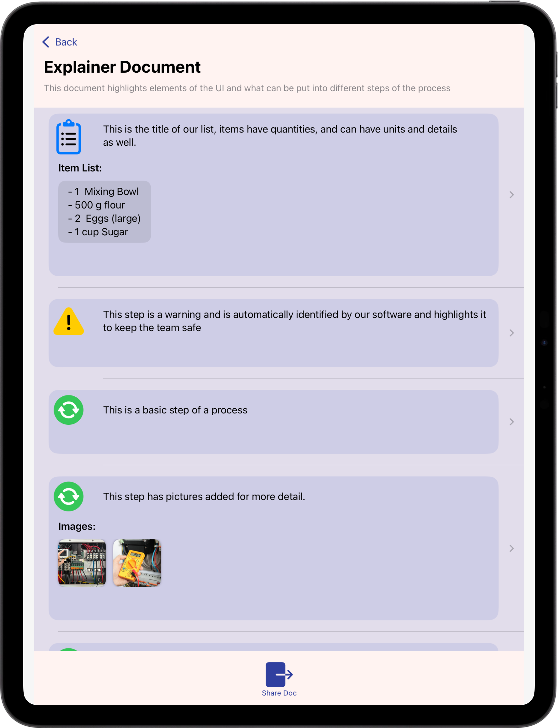 Snap a photo or record a quick video on the floor and attach it directly to any step without leaving the workflow.